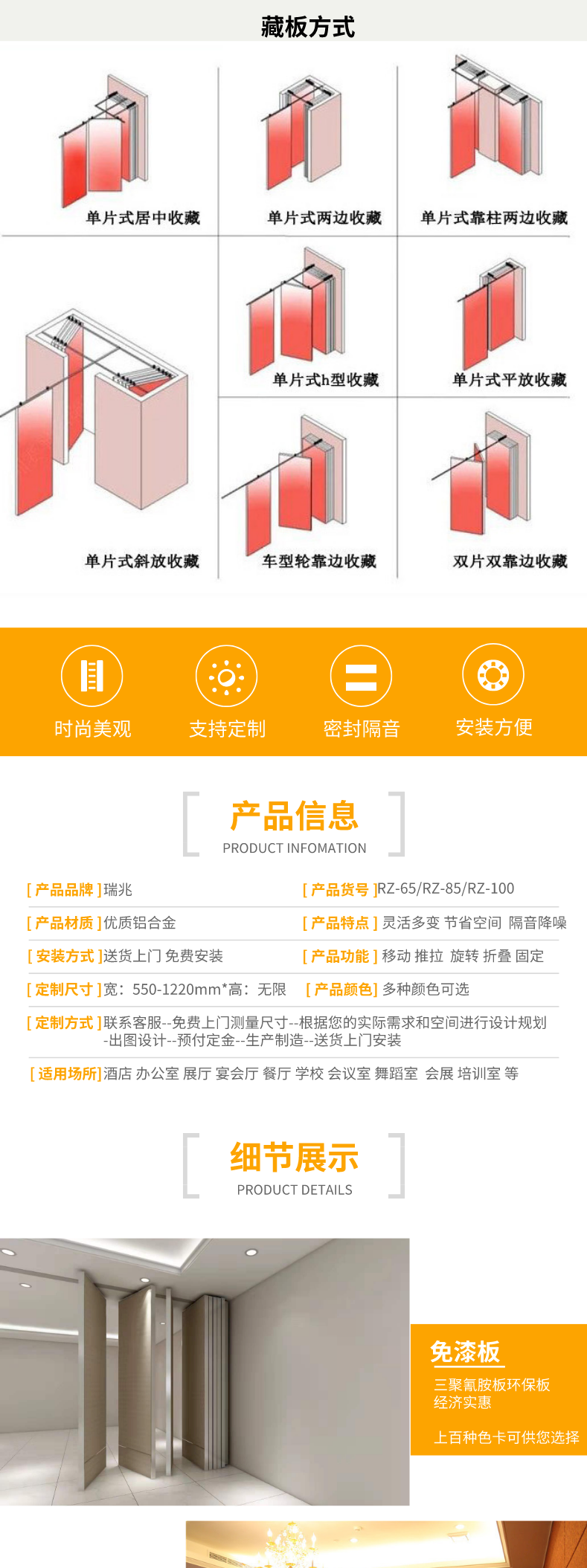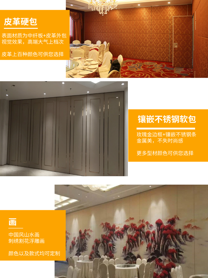廣州市瑞兆裝飾材料有限公司,簡稱瑞兆隔斷,隔斷屏風(fēng)可分為單片式和雙片式兩種。 頂部采用新型道軌及吊輪,可以全方向、多角度靈活組合空間。 屏風(fēng)邊框根據(jù)不同場(chǎng)景的需求定做各種款式的隔斷。 適用范圍:大型會(huì)展中心,酒店、商務(wù)會(huì)議場(chǎng)所、咖啡廳、商場(chǎng)、醫(yī)院、教會(huì)、展廳、國際學(xué)校及政府機(jī)構(gòu)辦事處等各類型室內(nèi)場(chǎng)所。 顯著特點(diǎn):以經(jīng)濟(jì)、快捷、合理的方式來分隔、分割不同類型活動(dòng)空間; 可提供獨(dú)立而不受干擾的空間; 無須地面安裝軌道,保證裝飾地面的完整性。 另外屏風(fēng)隔斷組合中可帶有門中門,讓您的使空間更加靈活多變。